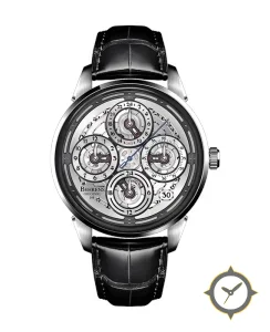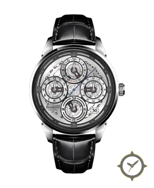 A Skeleton watch with a bold 46.5mm presence on the wrist, crafted from stainless steel featuring a silver dial with a unique open-worked / skeletonized with visible movement finish.