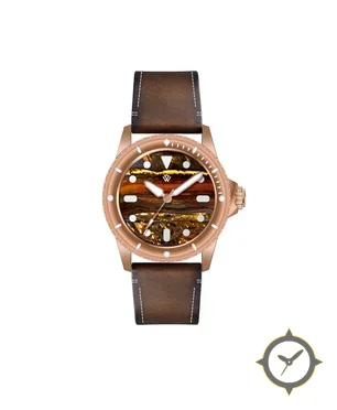 A Dive watch with a vintage-inspired 35mm case, crafted from bronze featuring a brown dial with a unique stone / tiger-eye texture finish.