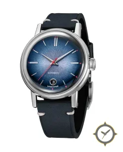 A Dress watch with a bold 43.5mm presence on the wrist, crafted from stainless steel featuring a blue dial with a unique sunburst finish.