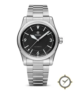 A Field watch with a vintage-inspired 34.5mm case, crafted from stainless steel featuring a black dial with a unique matte finish.