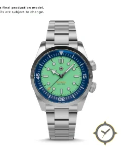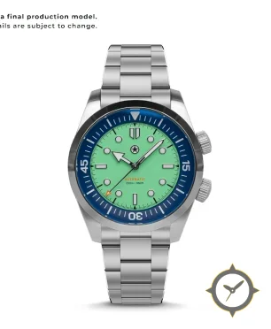 A Dive watch with a bold 43.5mm presence on the wrist, crafted from stainless steel featuring a turquoise dial with a unique luminous finish.