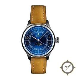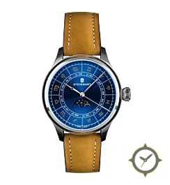 A Dress watch with a bold 48.5mm presence on the wrist, crafted from stainless steel featuring a blue dial with a unique sunburst finish and a true GMT complication for tracking a second time zone.