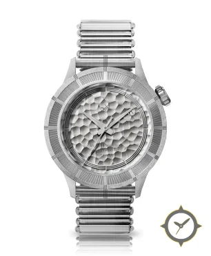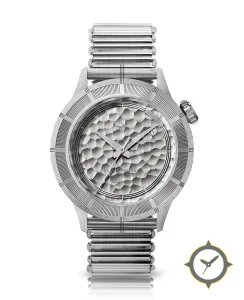 A Luxury watch with a versatile 38mm case, that suits most wrists, crafted from stainless steel featuring a silver dial with a unique hammered/engine-turned finish.