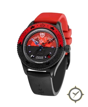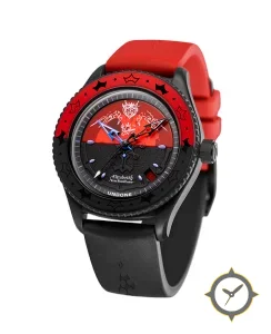 A Dive watch with a bold 46.5mm presence on the wrist, crafted from stainless steel featuring a red dial with a unique upper glossy red / lower textured matte black (two-tone) finish.