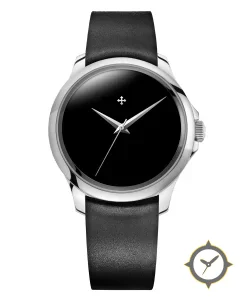 A Minimalist watch with a bold 43mm presence on the wrist, crafted from stainless steel featuring a black dial with a unique high-gloss lacquer finish.