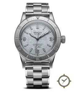A Dive watch with a vintage-inspired 37mm case, crafted from stainless steel featuring a silver dial with a unique frosted/ice-texture (textured, granular finish) finish.