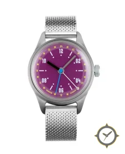 A GMT watch with a bold 44mm presence on the wrist, crafted from stainless steel featuring a purple dial with a unique brushed-metal finish and a true GMT complication for tracking a second time zone.