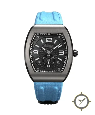 A Sports watch, crafted from stainless steel featuring a black dial with a unique brushed woven / carbon-fiber texture finish.