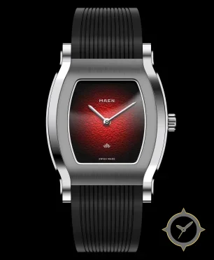 A Dress watch with a vintage-inspired 35mm case, crafted from stainless steel featuring a red dial with a unique grained / pebbled texture with fumé (gradient) finish finish.