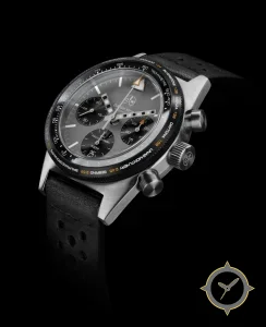 A Chronograph watch with a vintage-inspired 36mm case, crafted from stainless steel featuring a gray dial with a unique sunburst/metallic matte finish finish.