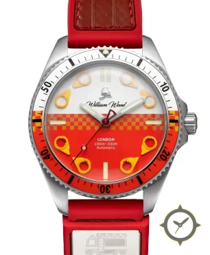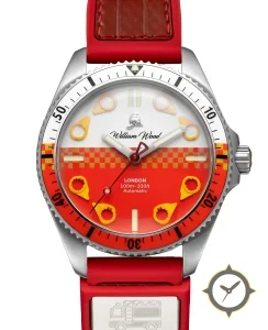 A Dive watch with a vintage-inspired 36mm case, crafted from stainless steel featuring a red dial with a unique lacquer finish.