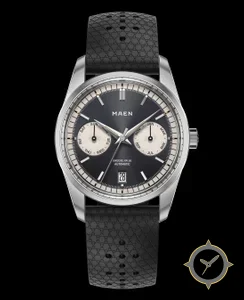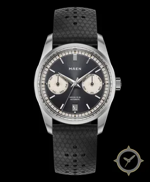 A Vintage watch with a vintage-inspired 33mm case, crafted from stainless steel featuring a gray dial with a unique sunburst brushed finish.