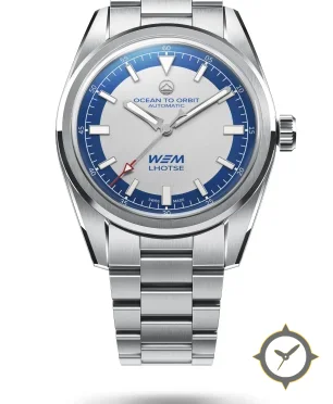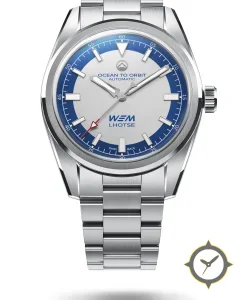 A Sports watch with a vintage-inspired 34.5mm case, crafted from stainless steel featuring a silver dial with a unique matte silver center with glossy blue outer chapter ring finish.
