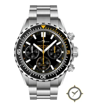 A Chronograph watch with a bold 50mm presence on the wrist, crafted from stainless steel featuring a black dial with a unique glossy finish.