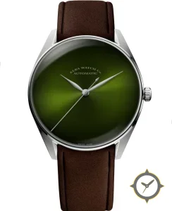 A Minimalist watch with a bold 46mm presence on the wrist, crafted from stainless steel featuring a green dial with a unique sunburst / fumé gradient finish.