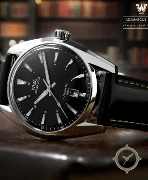 A Dress watch with a vintage-inspired 37.5mm case, crafted from stainless steel featuring a black dial with a unique matte lacquer finish.