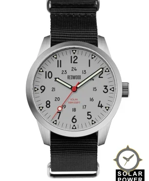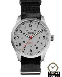 A Field watch with a vintage-inspired 35.5mm case, crafted from stainless steel featuring a gray dial with a unique matte finish.