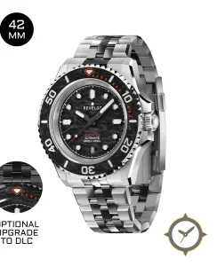 A Dive watch with a bold 43.5mm presence on the wrist, crafted from stainless steel featuring a black dial with a unique forged carbon / marbled carbon texture finish.