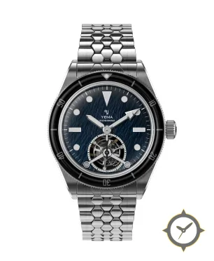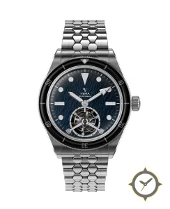 A Dive watch with a bold 49mm presence on the wrist, crafted from stainless steel featuring a navy dial with a unique textured, wavy/ocean finish finish.