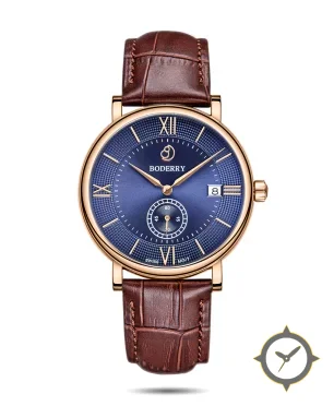 A Dress watch with a vintage-inspired 32mm case, crafted from gold featuring a blue dial with a unique sunburst center with guilloche textured outer track finish.