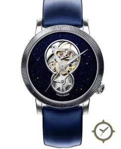 A Skeleton watch with a vintage-inspired 36.5mm case, crafted from stainless steel featuring a navy dial with a unique aventurine (sparkling/starry) finish.
