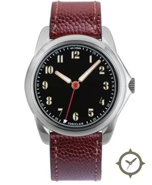 A Field watch with a versatile 40mm case, that suits most wrists, crafted from stainless steel featuring a black dial with a unique porcelain enamel, glossy finish.