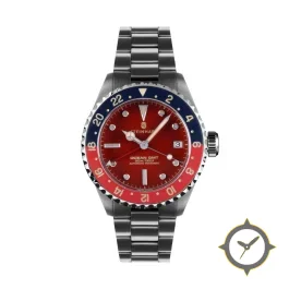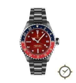 A GMT watch with a versatile 40.5mm case, that suits most wrists, crafted from stainless steel featuring a red dial with a unique sunburst lacquer finish and a true GMT complication for tracking a second time zone.