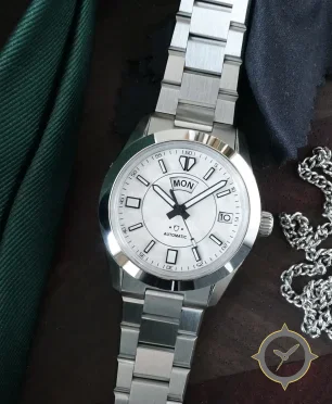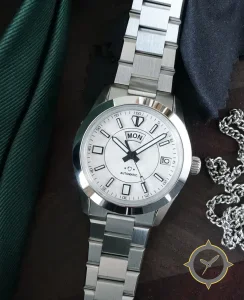 A Sports watch with a vintage-inspired 37.5mm case, crafted from stainless steel featuring a white dial with a unique mother-of-pearl finish.