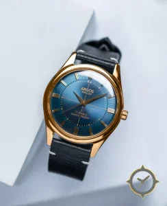 A Dress watch with a versatile 39.5mm case, that suits most wrists, crafted from gold featuring a blue dial with a unique radial sunburst with a ribbed/engraved outer chapter ring finish.