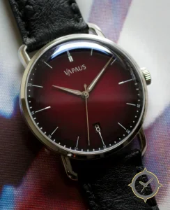 A Dress watch with a versatile 38mm case, that suits most wrists, crafted from stainless steel featuring a red dial with a unique sunburst (radial gradient) finish.