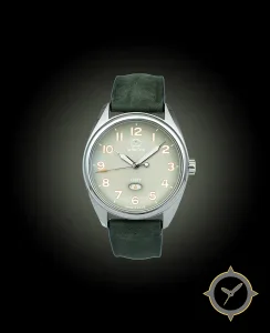 A GMT watch with a vintage-inspired 37.5mm case, crafted from stainless steel featuring a green dial with a unique matte (sunburst/soft grain) finish and a true GMT complication for tracking a second time zone.