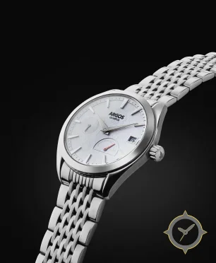 A Dress watch with a vintage-inspired 34mm case, crafted from stainless steel featuring a white dial with a unique subtle textured / meteorite-like finish finish and a helpful power reserve indicator.