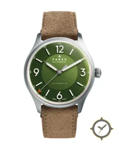A Field watch with a versatile 39.5mm case, that suits most wrists, crafted from stainless steel featuring a green dial with a unique sunburst finish.
