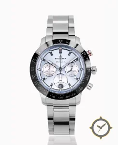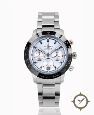 A Chronograph watch with a vintage-inspired 32.5mm case, crafted from stainless steel featuring a silver dial with a unique sunburst / radial brushed finish finish.
