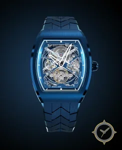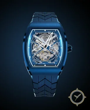 A Skeleton watch, crafted from stainless steel featuring a blue dial with a unique open-worked skeleton with visible gears and bridges finish.