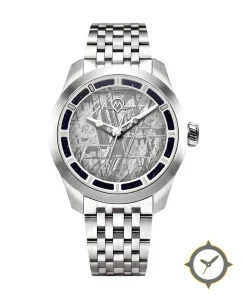 A Sports watch with a versatile 38mm case, that suits most wrists, crafted from stainless steel featuring a gray dial with a unique meteorite-like stone texture finish.