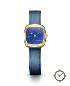 A Dress watch with a vintage-inspired 21mm case, crafted from gold featuring a blue dial with a unique lapis lazuli (natural stone) finish.