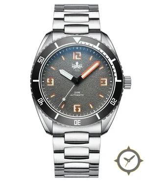A Dive watch with a bold 49.5mm presence on the wrist, crafted from stainless steel featuring a gray dial with a unique textured/grainy (sandblast) finish.