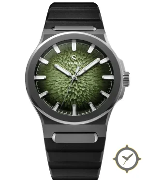 A Sports watch with a bold 43mm presence on the wrist, crafted from titanium featuring a green dial with a unique three-dimensional radial petal/crystalline relief finish.