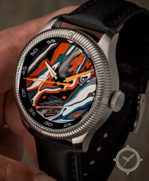 A Dive watch with a vintage-inspired 36mm case, crafted from stainless steel featuring a orange dial with a unique high-gloss swirled/marble-like stratified finish finish.