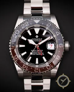 A GMT watch with a bold 45.5mm presence on the wrist, crafted from stainless steel featuring a black dial with a unique glossy lacquer finish and a true GMT complication for tracking a second time zone.