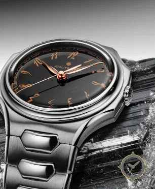 A Luxury watch with a bold 46mm presence on the wrist, crafted from stainless steel featuring a black dial with a unique high-gloss lacquer finish.