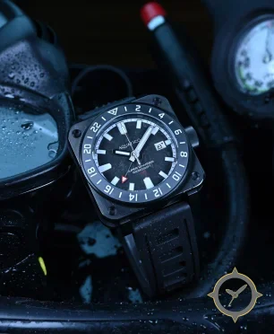 A Dive watch with a bold 45.5mm presence on the wrist, crafted from stainless steel featuring a black dial with a unique forged carbon finish.