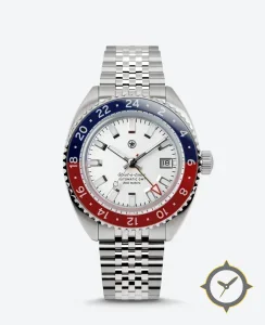 A GMT watch with a bold 47mm presence on the wrist, crafted from stainless steel featuring a white dial with a unique sunburst finish and a true GMT complication for tracking a second time zone.