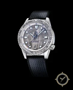 A Dive watch with a vintage-inspired 34mm case, crafted from stainless steel featuring a gray dial with a unique meteorite finish.