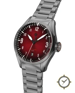 A Pilot watch with a bold 47mm presence on the wrist, crafted from stainless steel featuring a red dial with a unique sunburst finish.