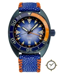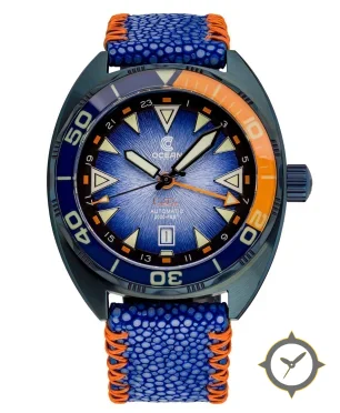 A Dive watch with a versatile 39mm case, that suits most wrists, crafted from stainless steel featuring a blue dial with a unique sunburst radial finish and a true GMT complication for tracking a second time zone.