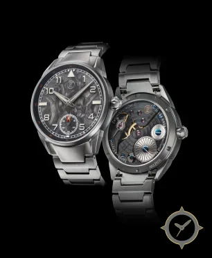 A Pilot watch with a bold 41.5mm presence on the wrist, crafted from titanium featuring a gray dial with a unique forged-carbon / marbled texture finish.