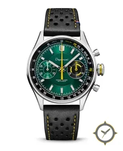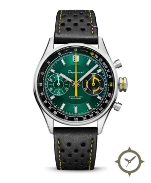 A Chronograph watch with a vintage-inspired 36.5mm case, crafted from stainless steel featuring a green dial with a unique sunburst finish.
