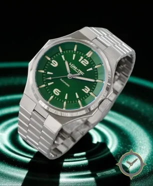 A Sports watch with a bold 49.5mm presence on the wrist, crafted from stainless steel featuring a green dial with a unique sunburst finish.